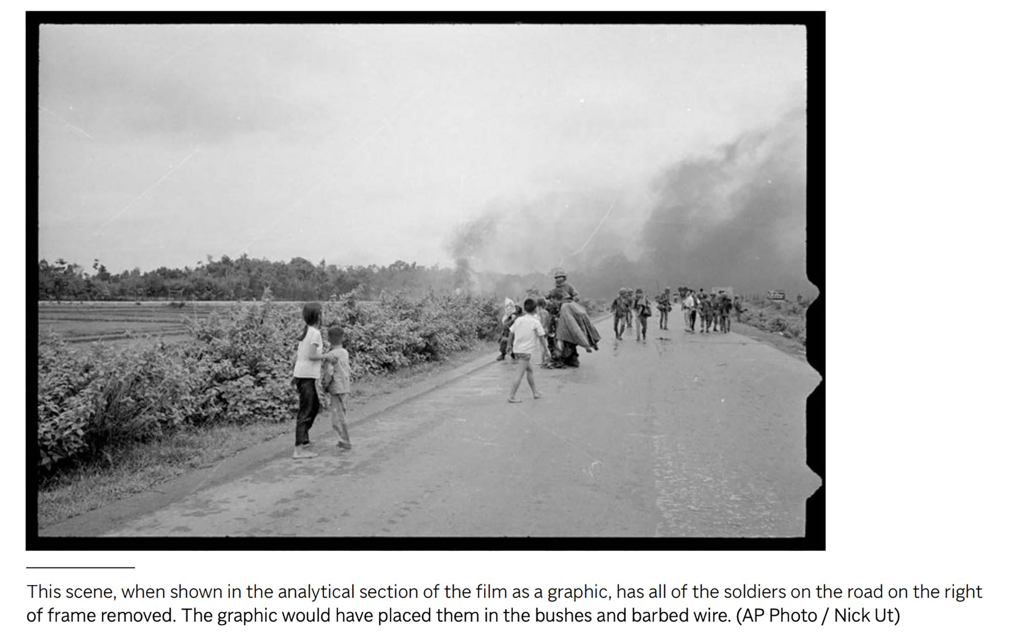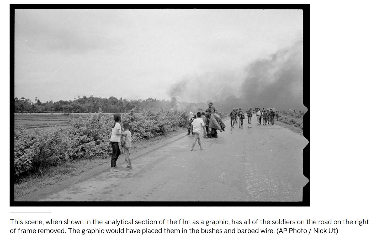 While the documentary presents this rendering as irrefutable evidence, AP has disputed the 3D model and its conclusions. After almost a year of its own investigation and a public ninety-page report, the agency argues that the render is flawed, built on selective assumptions and incorrect environmental details that make it unable to exclude Nick Ut in any definitive way. AP produced its own account of the scene through a detailed chronological sequence and photographs, which I found more coherent and easier to follow than the confusing 3D model. Although the agency’s conclusion remains unsatisfying because the physical evidence is incomplete, it does challenge the film’s smoking gun assertion that Ut could not have been close enough to make the image, stating: